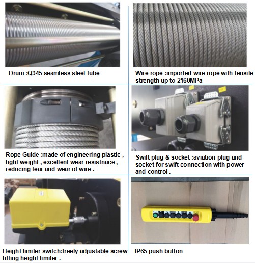 欧洲钢丝绳电动葫芦由以下组件组成:起升驱动,小车驱动,电控箱,导绳器,钢丝绳,卷筒,限位器和吊钩组。借助这些优越的配置,提升机可以平稳有效地运行。每个零件都有不同的功能,带来工作性能。
